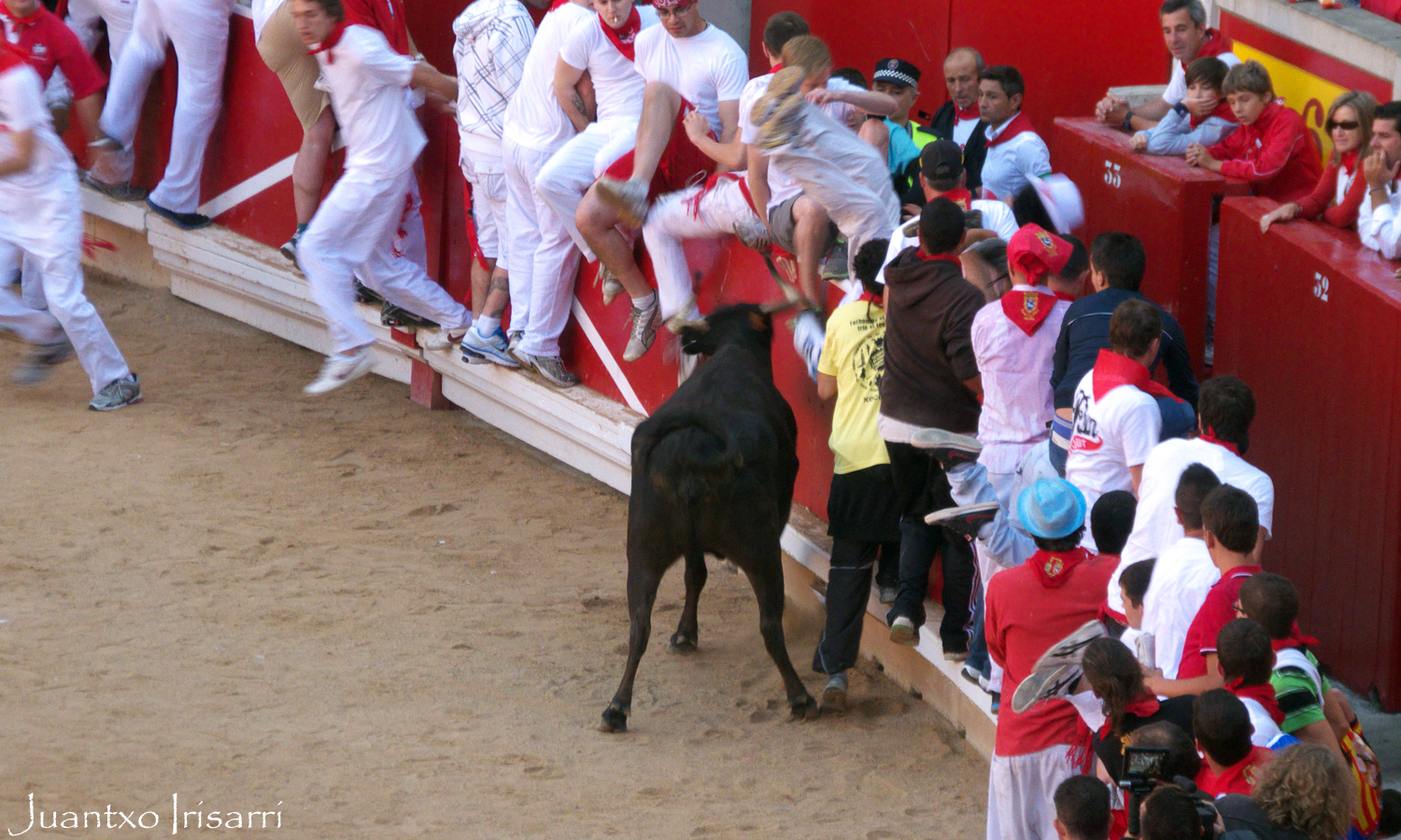 Sanfermines, 13 de julio de 2012La suelta de vaquillas en el coso taurino viene a ser el colofón al encierro de toros. Comienza cuando la última manada de mansos, tras el último toro, ha entrado en los corrales de la plaza.